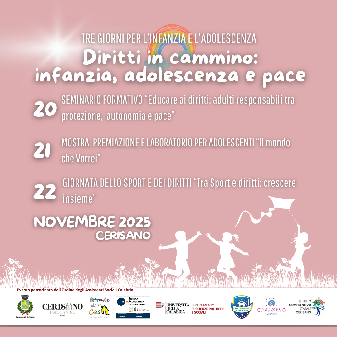 In occasione della Giornata Mondiale dell’Infanzia e dell’Adolescenza (20 novembre), il Progetto SAI del Comune di Cerisano – ente attuatore Cooperativa Strade di Casa, in collaborazione con la Pro Loco di Cerisano, l’Università della Calabria, l’Ordine degli Assistenti sociali della Calabria, l’Istituto Comprensivo di Cerisano, l’Asd Cerisano, promuove una tre giorni di eventi, formazione e partecipazione dedicata alla promozione dei diritti dei bambini e degli adolescenti. L’iniziativa nasce dal desiderio di costruire una comunità educante consapevole e attiva, capace di promuovere pace, accoglienza, inclusione e responsabilità adulta. Attraverso momenti di riflessione, creatività, espressione e gioco, Cerisano diventa un luogo simbolico dove i diritti dei più piccoli prendono forma nella cultura, nell’educazione e nella vita quotidiana. Gli obiettivi sono: