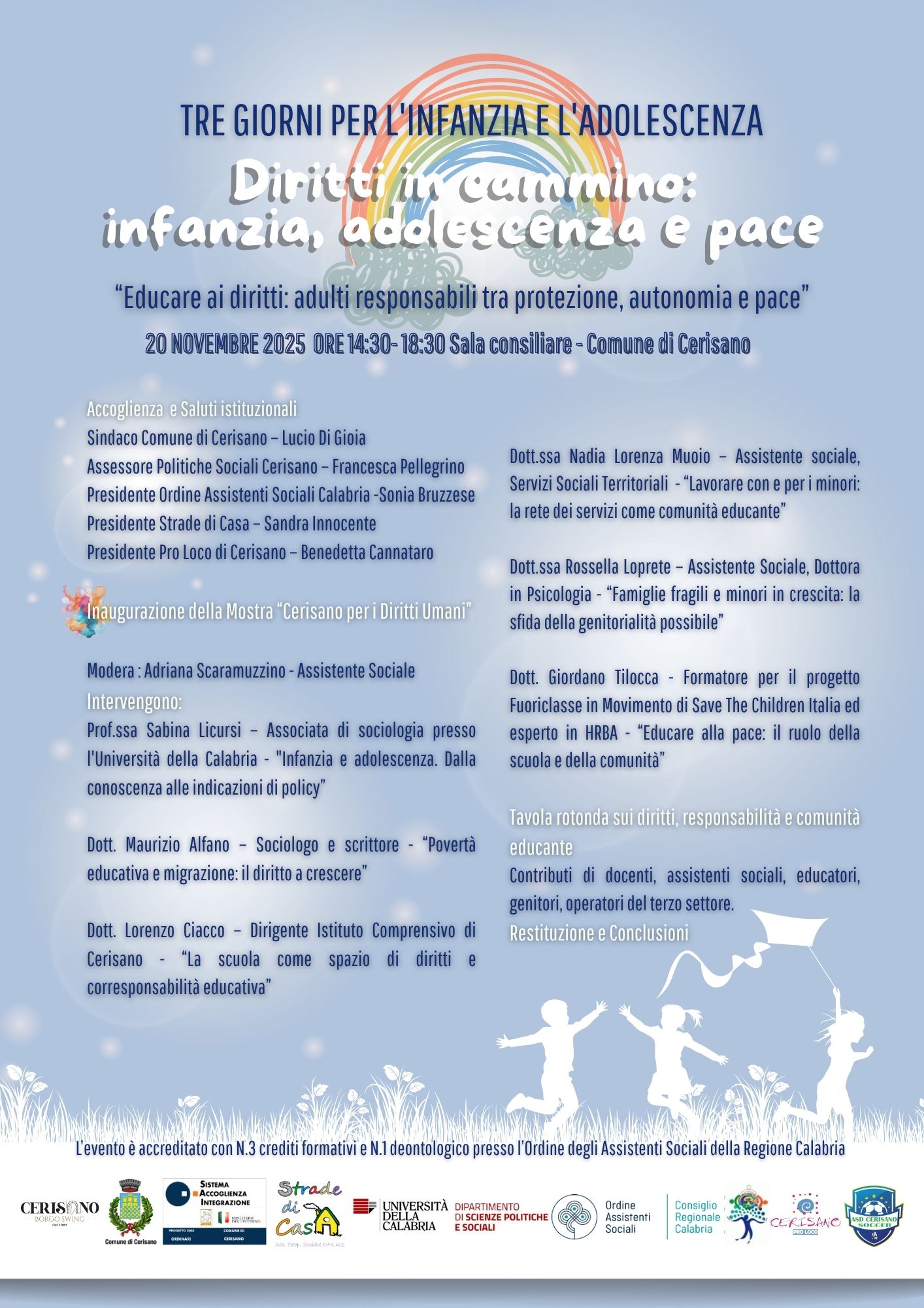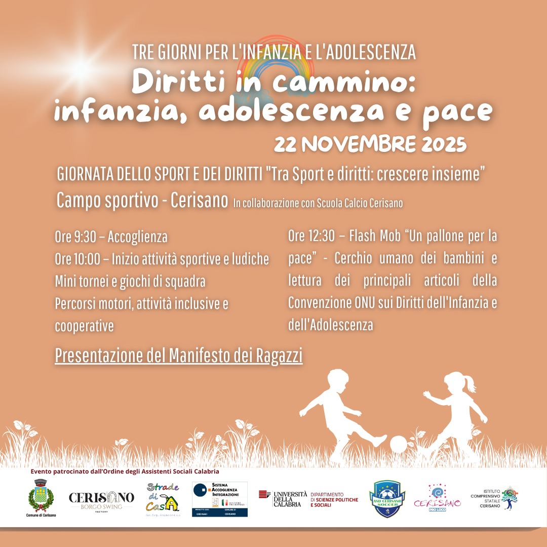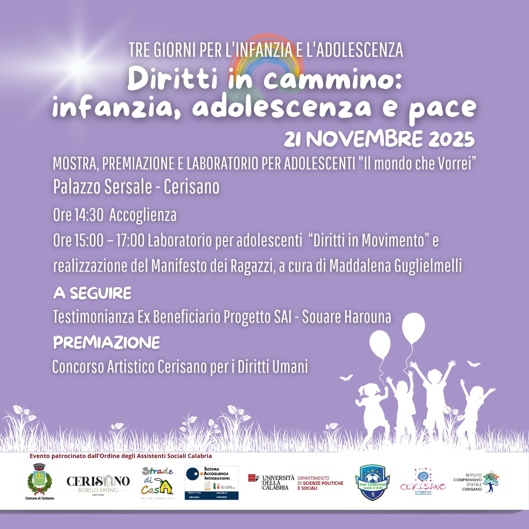 In occasione della Giornata Mondiale dell’Infanzia e dell’Adolescenza (20 novembre), il Progetto SAI del Comune di Cerisano – ente attuatore Cooperativa Strade di Casa, in collaborazione con la Pro Loco di Cerisano, l’Università della Calabria, l’Ordine degli Assistenti sociali della Calabria, l’Istituto Comprensivo di Cerisano, l’Asd Cerisano, promuove una tre giorni di eventi, formazione e partecipazione dedicata alla promozione dei diritti dei bambini e degli adolescenti. L’iniziativa nasce dal desiderio di costruire una comunità educante consapevole e attiva, capace di promuovere pace, accoglienza, inclusione e responsabilità adulta. Attraverso momenti di riflessione, creatività, espressione e gioco, Cerisano diventa un luogo simbolico dove i diritti dei più piccoli prendono forma nella cultura, nell’educazione e nella vita quotidiana. Gli obiettivi sono: