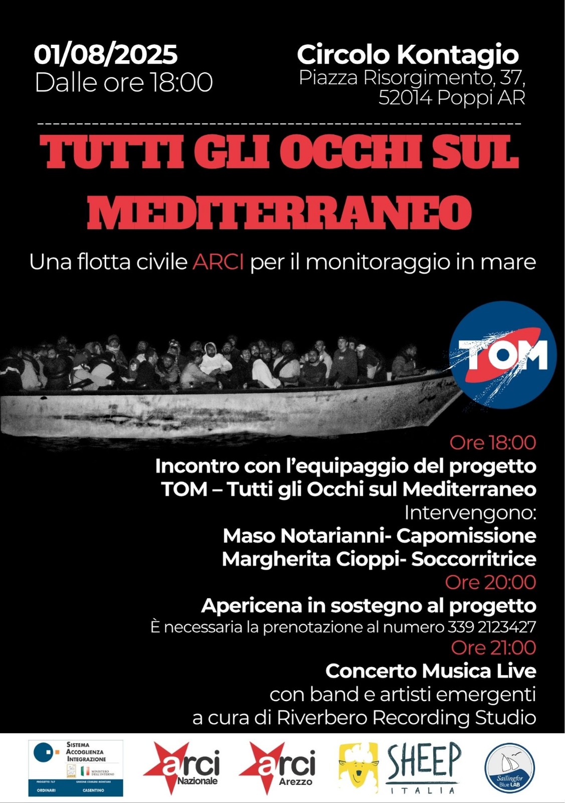 In allegato il volantino di un’iniziativa che riporta una testimonianza diretta dell’equipaggio del Progetto TOM (Tutti gli Occhi sul Mediterraneo) e di un concerto di alcuni gruppi musicali di giovani del territorio