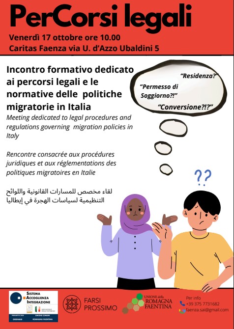 Alleghiamo la locandina dell’evento “percorsi legali” dei permessi di soggiorno in Italia che si terrà a Faenza