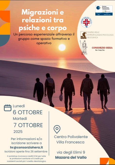 Alleghiamo la locandina dell’evento formativo denominato “Migrazioni e relazioni tra psiche e corpo”  che si svolgerà il giorno 6 e 7 ottobre 2025.  presso il Centro Polivalente  Villa Francesca sito in Mazara del Vallo  in via degli Elimi 9.
