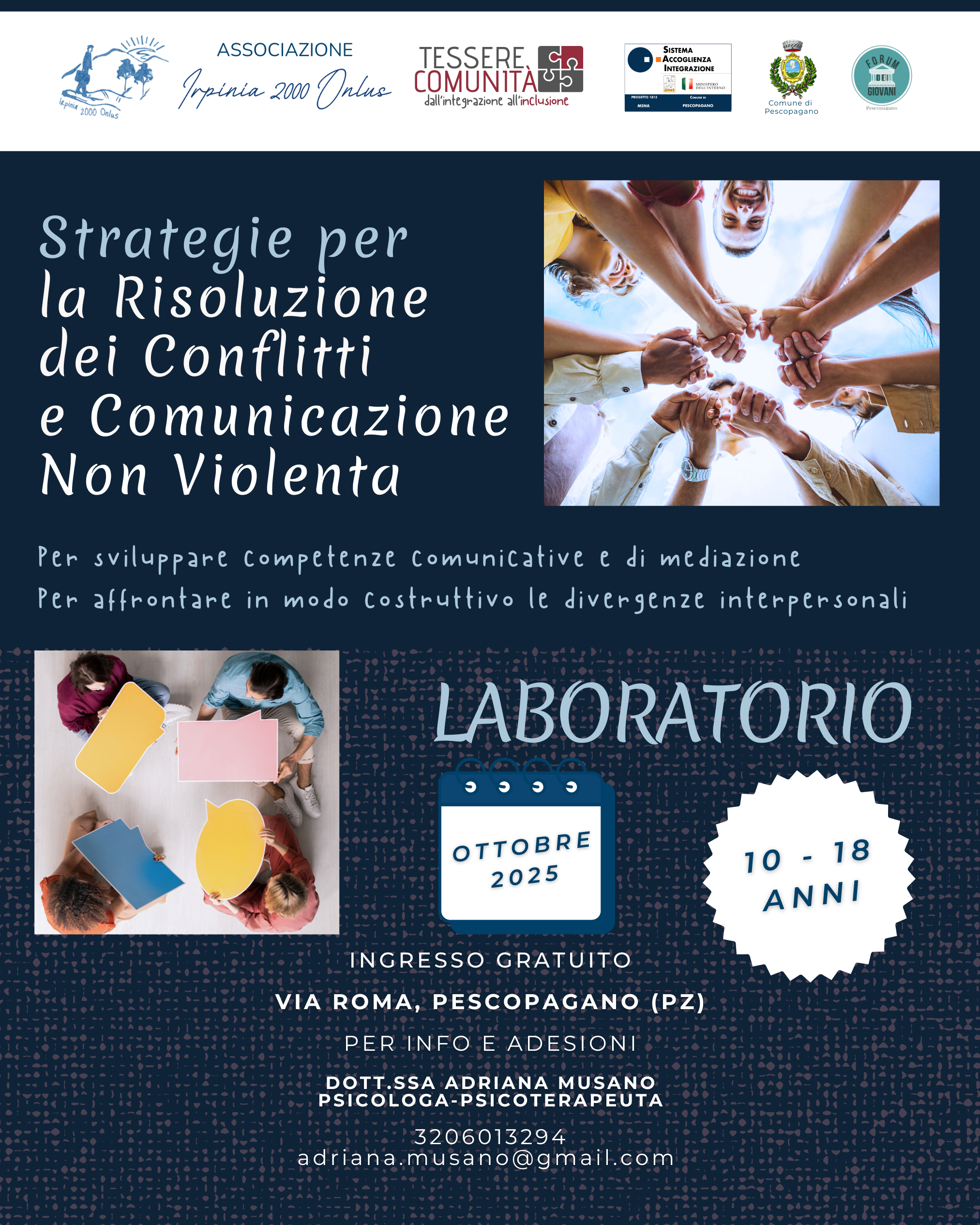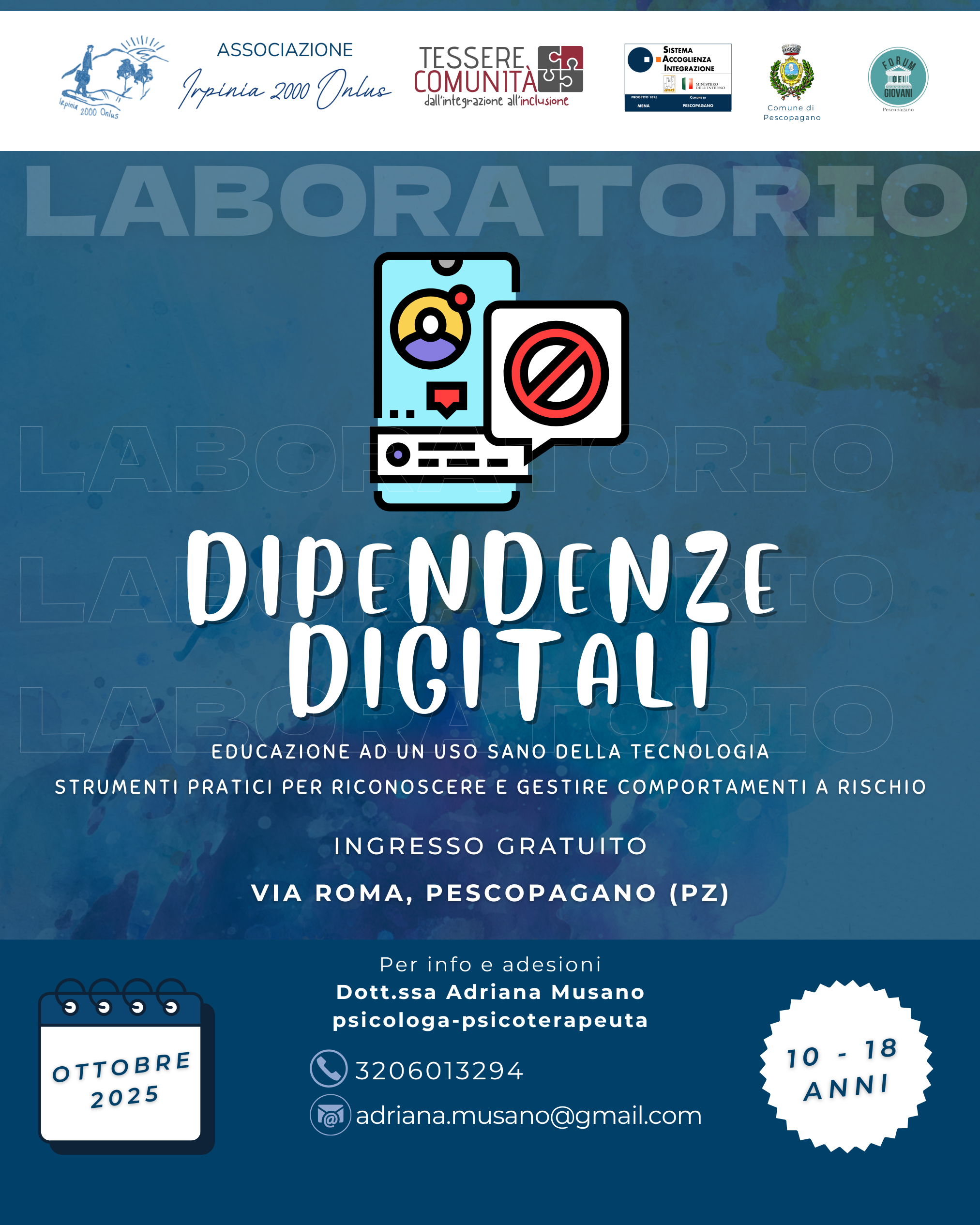 Il Centro SAI di Pescopagano e l’Associazione Irpinia 2000 Onlus promuovono, in collaborazione con Comune di Pescopagano e Forum dei Giovani, due laboratori nel mese di ottobre 2025 destinati ai minori della comunità locale e ai minori stranieri non accompagnati del centro. Un laboratorio avrà come tema le “Dipendenze digitali”, con un percorso di educazione ad un uso consapevole della tecnologia e con strumenti pratici per riconoscere e gestire comportamenti a rischio; l’altro, denominato “Strategie per la risoluzione dei conflitti e Comunicazione non violenta”, è finalizzato allo sviluppo di competenze comunicative e di mediazione per affrontare e superare in modo costruttivo le divergenze interpersonali.