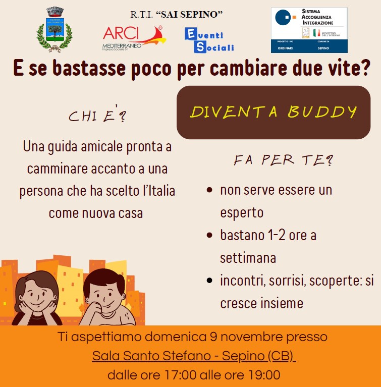 Segnaliamo l’iniziativa promossa dal progetto SAI del Comune di Sepino , intitolata “Diventa Buddy – Community Matching Sepino”, che si terrà domenica 9 novembre 2025 presso la Sala Santo Stefano di Sepino (CB), dalle ore 17:00 alle 19:00.